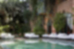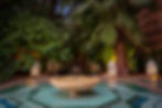 L'arrivée se fait de plain-pied entre les jardins d'eau plantés de jacinthe d'eau, de nénuphars et de papyrus. La fontaine en zellige croule sous un épais tapis de pétales de roses, la subtilité du ton est vite donnée !
